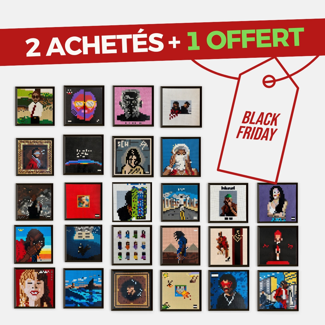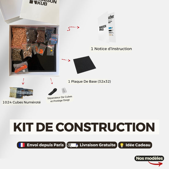 Chaque kit Maison KUB inclut une plaque de base 32 × 32, une notice imprimée et 1024 briques réparties dans des sachets numérotés… Prêt à construire votre pochette d’album préférée !