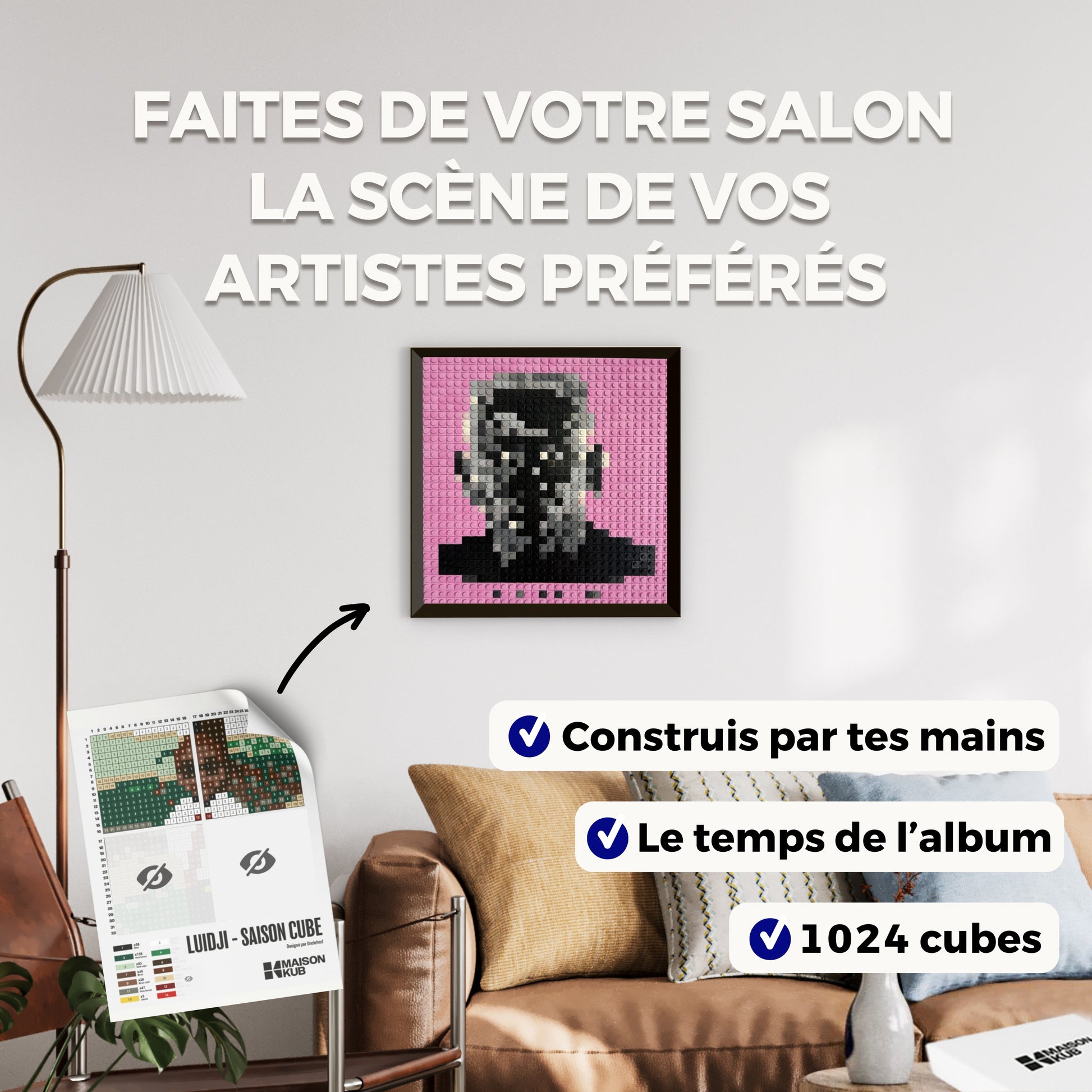 Chaque kit Maison KUB inclut une plaque de base 32 × 32, une notice imprimée et 1024 briques réparties dans des sachets numérotés… Prêt à construire votre pochette d’album préférée !